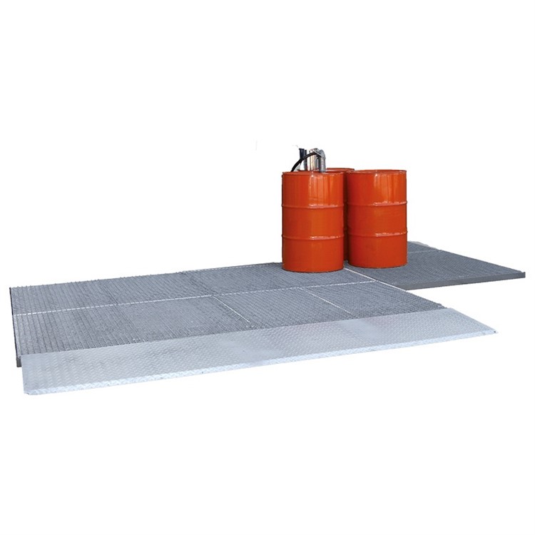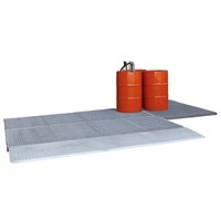 Arbetsgolv för lagring av miljöfarliga och brandfarliga vätskor. Konstruktion av 3 mm stålplåt S 235 JR G2 enligt EN 10025. Avstånd mellan elementen 40 mm vardera. Hjullast 450 kg. Med högt korrosionsskydd genom varmförzinkning eller grundning och industrilackering. Uttagbar galler för enkel rengöring. Kombinera golven valfritt efter eget behov.