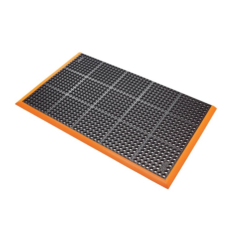 Matta för tung idustriell miljö. Försedd med väl synliga kanter i orangefärgade nitrilgummi på 3 sidor för extra säkerhet, uppfyller OSAH kod 1910-144. Dräneringshål och upphöjda dubbar undertill möjliggör utmärkt dränering, vilket lämnar en torr och snygg ovansida. Halkskydd R10 enligt DIN51130 och BG -regel BGR181. Total tjocklek: 22 mm. Designad för att motstå industrioljor och starka kemikalier. Lämplig i både torra och våta utrymmen. Färg: svart och svart/orange