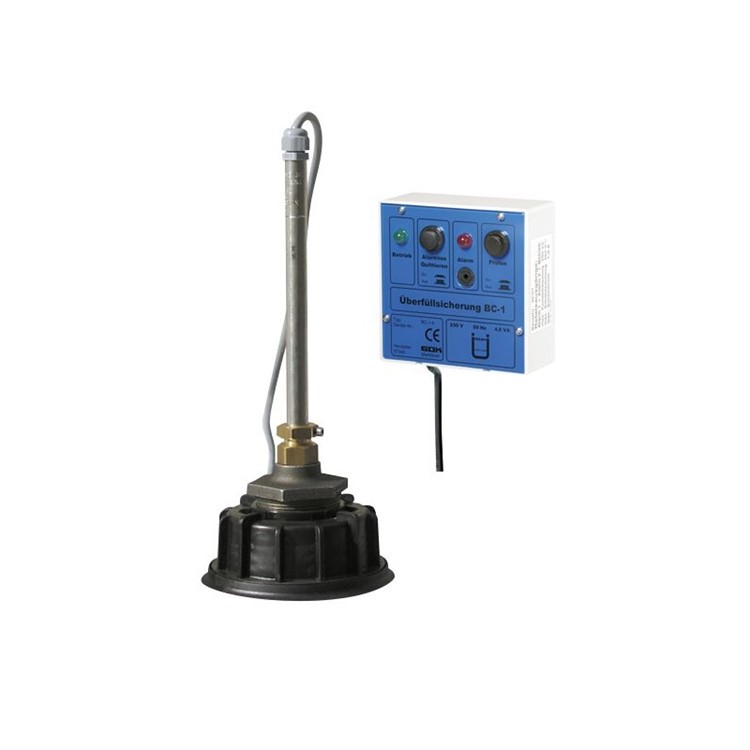 Komplett överfyllnadsskydd 230V. Nivåsändare (givarlängd 250 mm) med skruvad anslutning R 1 ". Varningsdisplay med ljud och lampa.