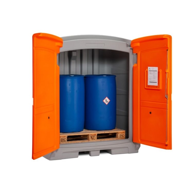 Fatdepå för 2x200L fat, låsbar dörr. Fatdepån är tillverkade av grå & orange polyeten vilket gör den kompatibla med ett stort antal vätskor. 2x200L fat, eller för små behållare. Färdig monterade, gaffelfickor för enkel förflyttning, kemikaliebeständig, för utomhus och inomhus. Möjlighet till invändig belysning Uppsamlingsvolym: 220L. Maxvikt: 600kg.