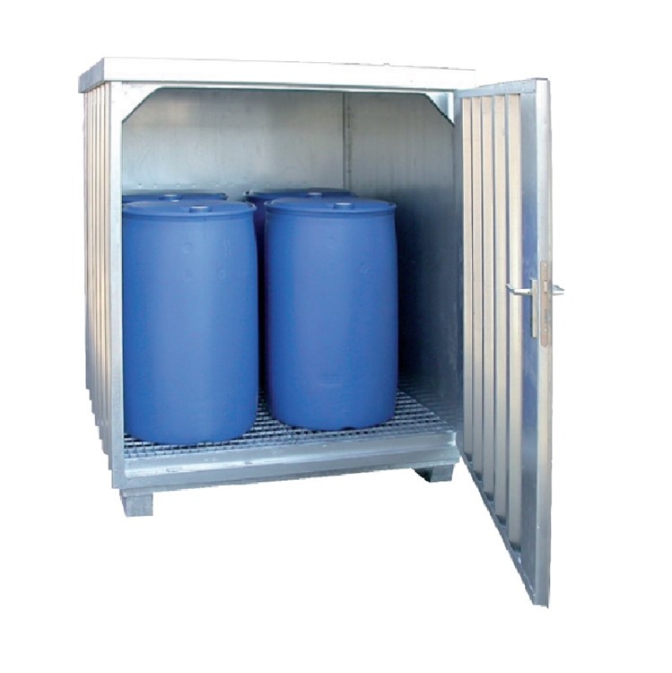 Lagringsdepå SLH-NB 1.5x1.5, galvad, naturlig ventilation (0,4 luftomsattningar i timmen) genom ventilationsöppningar i dörr och vägg. Generösa mått som gör det möjligt att lagra 4x200-liters fat direkt eller på pallar över uppsamlingskaret. Godkänd for lagring av miljöfarliga ämnen och för passiv lagring av brandfarliga vätskor. Konstruerad av 3mm galvaniserad stålplåt. Uppsamlingskar av 3 mm stålplåt, vätsketät svetsning. Kan låsas med hänglås. Dörrmått B1300 x H1580mm. Frihöjd 100 mm
