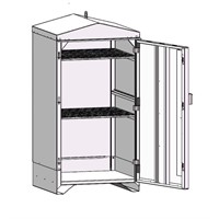 Gasförråd för förvaring inom och utomhus. Konstruktionen är av 1,5 mm Zinkbelagd stålkärna ZnAlMg detta är en metallbeläggning som ger skydd i de tuffaste miljöerna. ZnAlMg har avsevärt bättre korrosionsmotstånd än varmförzinkat stål En av ZnAlMg stora fördelar är dess förmåga att självläka klippta och perforerade kanter. Plåten har en hårdare yta och är reptåligare än traditionellt varmgalvat material. Plåten kan målas på samma sätt som andra metallbelagda stål. Skåpet bultas och nitas ihop. Låsning sker med 3-punkts låshake och hänglås (bygelhöjd 25mm). Godkänd försäkringsklass 2. Dörröppning 100º. Ventilation “självdrag”. Invändiga ej synliga gångjärn med avhakningssäkring. Fäste för 2 kg pulversläckare är förberett i taket. Hyllplan av hävlaröster 4 stycken 925x415 mm är standard. Invändigt mått L965xB860xH1660mm. Transportmått: L990xB1060xH2020mm.