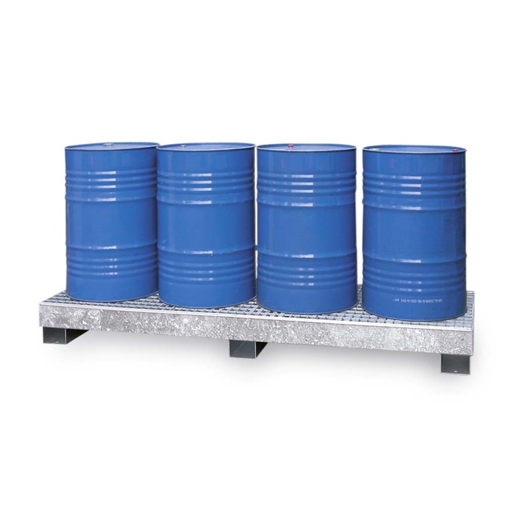 Miljöpall CW 4-fats Inline inkl. varmgalv, galvat galler. Uppsamlingskar för lagring och förvaring av vattenskadande och brännbara vätskor. Kar av 3 mm stålplåt S 235 JR G2 enligt EN 10025. Uttagbara, varmförzinkade galler. Fri höjd undertill 100 mm för transport med gaffeltruck.