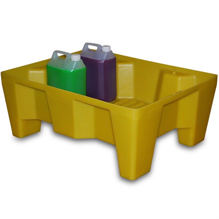 Spilltråg med ben utan galler för mindre behållare. Mindre uppsamlingskar i PE, idealisk för lagring och hantering av små behållare. Resistent mot de flesta kemikalier. Enkel att rengöra. Uppsamlingsvolym 70L.