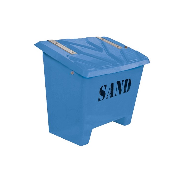 Sandlåda tillverkad i vakuuminjicerad polyester. Locket är korrugerat vilket ger stabilitet och styrka. Sandlådan och locket har inga råytor, både ut- och insida är helt släta. Gångjärn, bult och kätting är galvaniserade. Varje sandlåda har invändigt monterad kätting som stopp för locket i uppfällt läge. 10 cm höga ”ben” gör att sandlådorna lätt kan flyttas med truck. En utveckling av den klassiska sandlådan för vinterväghållning. Den bästa förvaringen av sandningssand eller salt. Sandlådorna är av väldigt hög kvalité och designade för att vara praktiska, hållbara och ha ett bra utseende. De passar perfekt på trafikplatser, busshållplatser, järnvägsstationer, bilparkeringar, torg och vid gångbanor.Levereras omonterade. Monteringsanvisning medföljer. Texten SAND är standard på sandlådan men annan text finns som tillval. Tillval: Låsbar låda med hänglåsöverfall. Gummistropp med beslag.