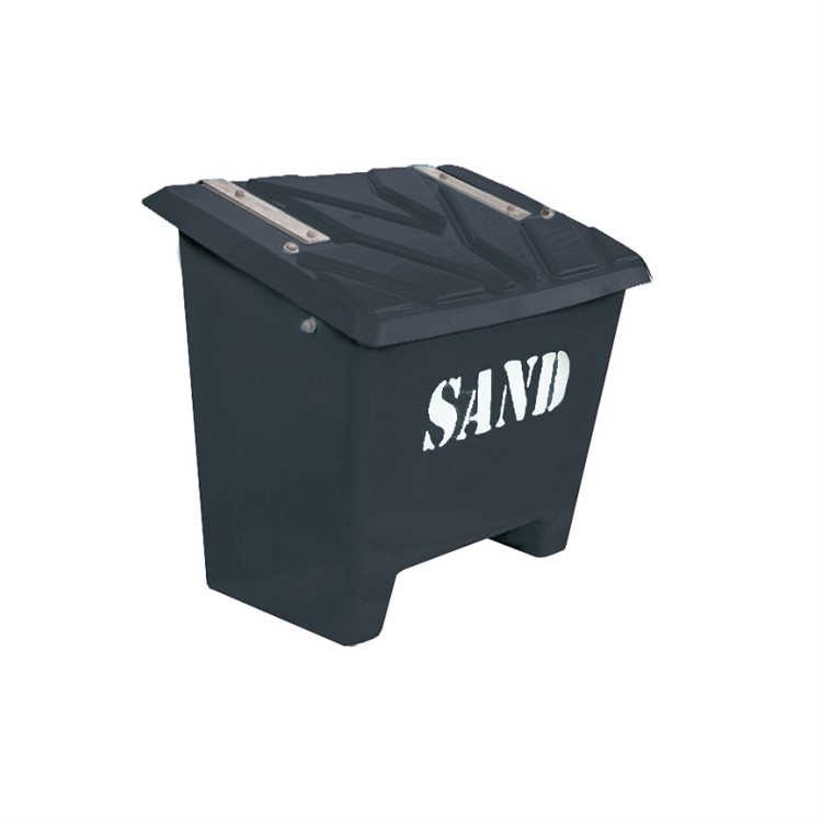 Sandlåda tillverkad i vakuuminjicerad polyester. Locket är korrugerat vilket ger stabilitet och styrka. Sandlådan och locket har inga råytor, både ut- och insida är helt släta. Gångjärn, bult och kätting är galvaniserade. Varje sandlåda har invändigt monterad kätting som stopp för locket i uppfällt läge. 10 cm höga ”ben” gör att sandlådorna lätt kan flyttas med truck. En utveckling av den klassiska sandlådan för vinterväghållning. Den bästa förvaringen av sandningssand eller salt. Sandlådorna är av väldigt hög kvalité och designade för att vara praktiska, hållbara och ha ett bra utseende. De passar perfekt på trafikplatser, busshållplatser, järnvägsstationer, bilparkeringar, torg och vid gångbanor.Levereras omonterade. Monteringsanvisning medföljer. Texten SAND är standard på sandlådan men annan text finns som tillval. Tillval: Låsbar låda med hänglåsöverfall. Gummistropp med beslag.