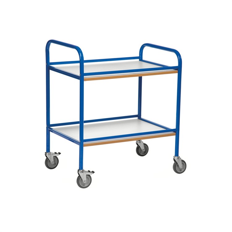Smidig serveringsvagn i 2 plan. Sarger som förhindrar att glas och tallrikar glider av. Pulverlackerad och hyllplan av laminat som gör att den är lätt att torka av. Levereras omonterad. Höjd till översta hyllplan 710 mm. Avstånd mellan hyllplan 400 mm. 4 länkhjul varav 2 med broms, 100 mm. Belastning: 100 kg.