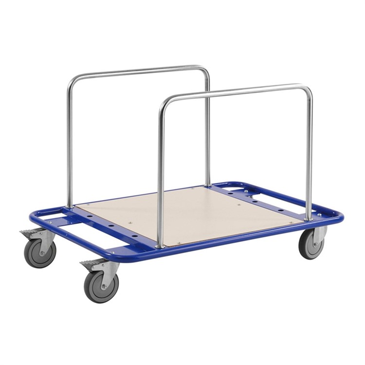 Enkel och smidig skivvagn för det lättare godset. Tålig skiva av laminat. Levereras omonterad. Flakhöjd 190 mm. Avstånd mellan byglar 135 mm. 5 byglar ingår (byglar skruvas ej, justerbara). 4 länkhjul varav 2 med broms, 125 mm. Belastning 150 kg