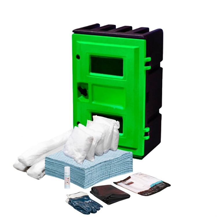 Oil Only SpillKit, vägghängt, 70L. Innehåller: 30st Universal ark, 5st Oil Only kuddar, 3st Oil Only ormar, 1 par skyddshandskar, 1st skyddsdräkt, 1st Sårtvätt och ögondusch sprayflaska 200ml, 2st avfallspåsar. (Endast box, artnr: JBDA85). UV-stabiliserad PE med gummipackning under lock möjliggör även utomhusförvaring.