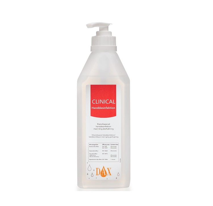 DAX Clinical Handdesinfektion är en hygienisk, flytande handdesinfektion som är utprovad i samarbete med svensk sjukvård. Produkten är effektiv mot bakterier, jästsvamp, mykobakterier och många typer av virus som t.ex. adenovirus, och murine norovirus. Produkten är etanolbaserad och har en alkoholhalt på 75 vol%. Innehåller två olika återfuktande ämnen.För effektiv desinfektion av händer inom sjukvården, tandvården, äldrevården, livsmedelssektorn etc. Applikation 3 ml i 30 sek