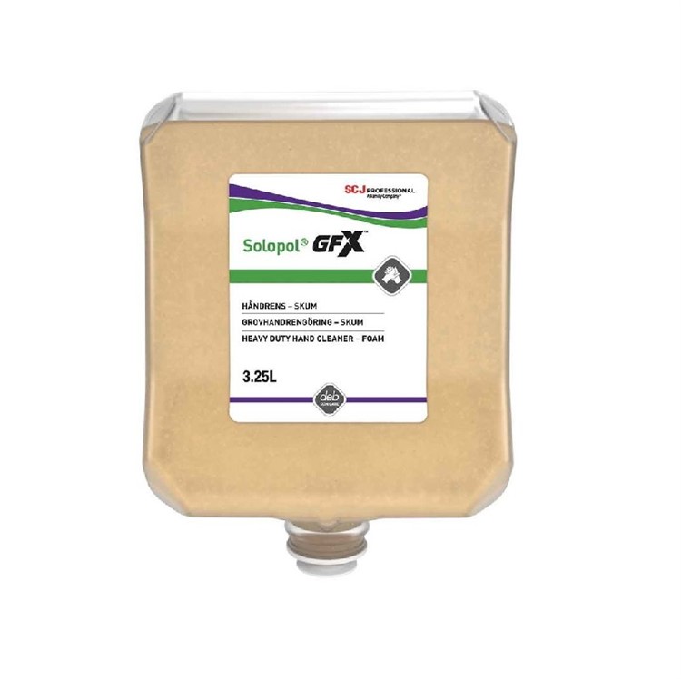 Världens första skumhandrengöring med skrubbmedel av majsgranulat och olivsten. Skumhandrengöringen avlägsnar effektivt grov industriell smuts som till exempel oljor, fett och smörjmedel. 3 ml Solopol® GrittyFOAM® vätska förvandlas till 15 ml skum, vilket ger 47 % mer handrengöring per liter jämfört med traditonella handrengörareEtt milt recept utan petroleumbaserade lösningsmedel, kombinerat med icke-nötande biologiskt nedbrytbara skrubbmedel som gör att händerna känns rena, fräscha och behagligt mjuka efter användning. Snabbverkande och kraftfullt skum. Inga rester på huden eller i avloppet. Passar till dispenser art.nr 2028570.