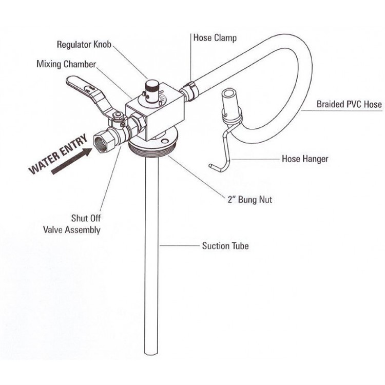 Injektorblandare för blandning 0-11% av olika vätskor t.ex. avfettning, microemulsioner, glykol, spolarvätska etc. Injektorn ansluts till lokalens vattenledningsnät samtidigt som sugrör ansluts till inblandningsvätskan. Injektorblandaren är försedd med utvändiga gänga G2" för fatanslutning. Utrustningen levereras med 1,0 m sugrör samt 0,6 m utloppsslang. Material som kommer i kontakt med vätskan är aluminium, rostfritt, stål, mässing, acetal, PVC, nitrilgummi NBR. Observera: Utloppet levereras med ett plaströr på max en meter. Den måste alltid vara öppen och får inte anslutas till enheter som kan begränsa vätskeflödet.